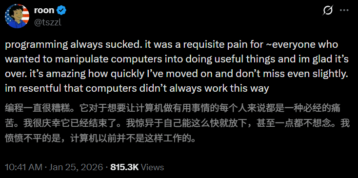 在Roon的评论区,人们开始集体对编程时代说再见。