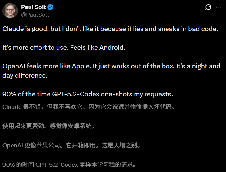 一些资深开发者评论道:在90%的情况下,GPT-5.2-Codex都能一次性完成我提出的请求。