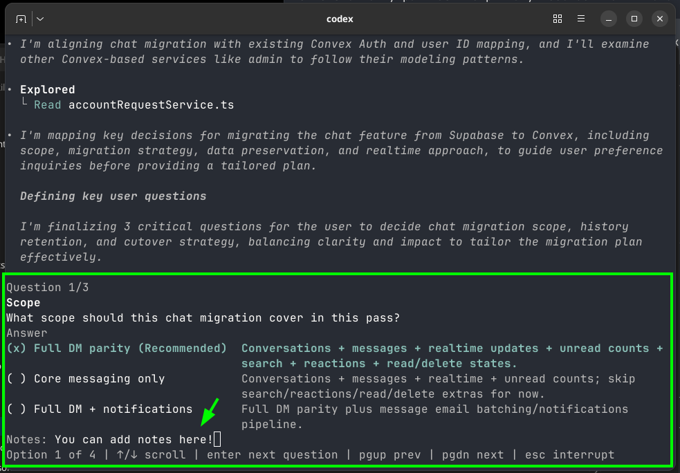 当Codex确实需要你输入时,它是结构化的,而且只有关键且聚焦的问题: