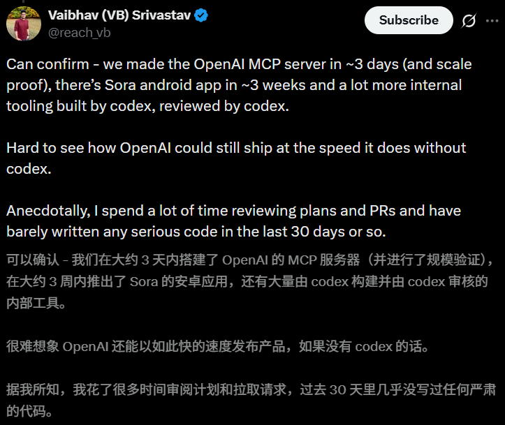 如果没有Codex的话,很难想象OpenAI能以如此惊人的速度发布产品。