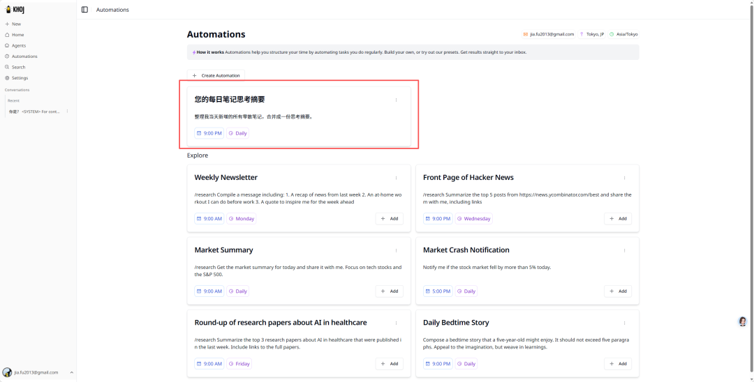 真正让我把 Khoj 当成“系统级工具”的,是 Automations。