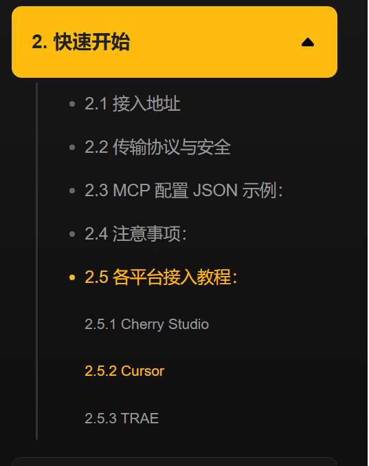 官网上不仅把 MCP 的调用流程写得非常清晰,还针对多个主流开发平台给出了完整示例,包括Cherry Studio、Cursor甚至国内的Trae。