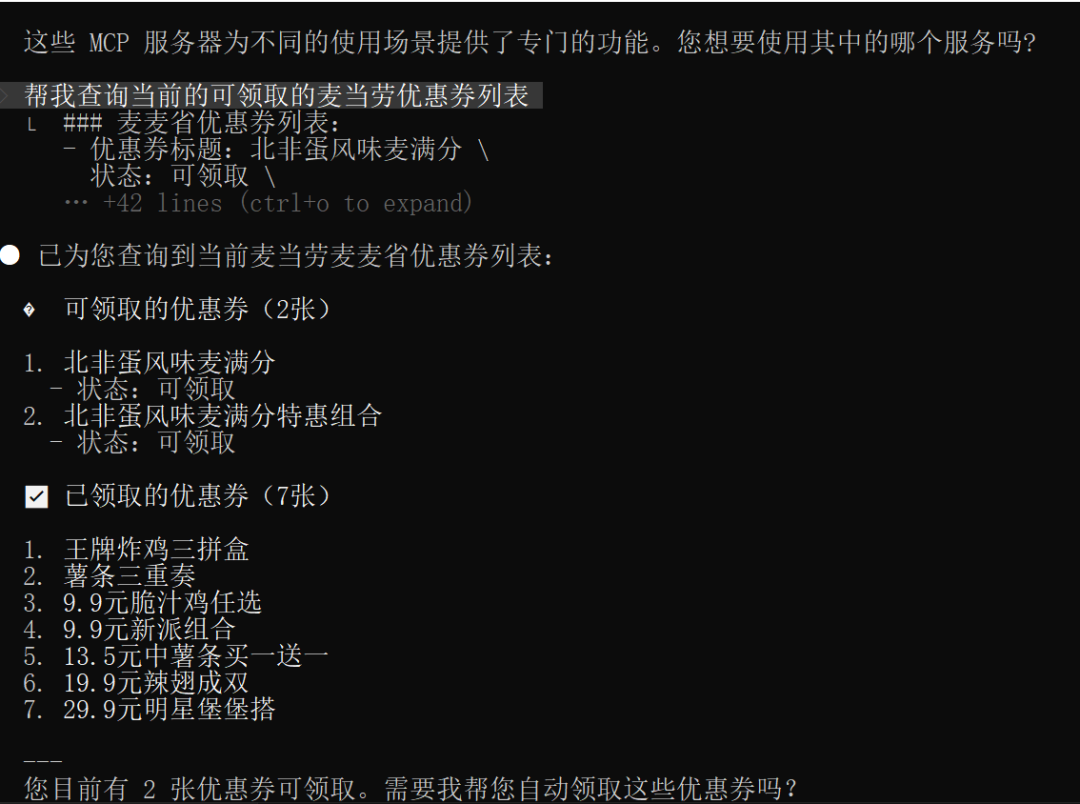 当我让 AI 帮我查看麦当劳账户状态时,它会自动通过 MCP 调用所有接口,查询我账号里的: