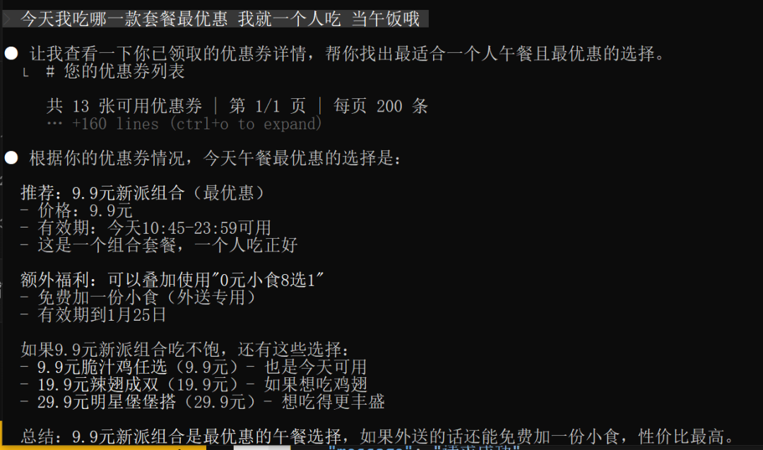 当然,AI还能根据反馈回来的优惠券信息进行二创,帮你判断吃哪一个套餐最便宜,甚至帮你规划后续怎么用这些券。实际体验后,这些建议并不实用。因为缺乏商品的详细信息,很多建议往往是信口雌黄。