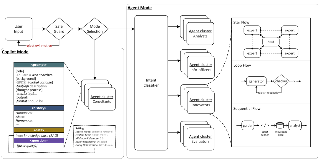 在协作模式上,框架结合顺序流程、循环验证流程与多专家协作流程,使 TRIZ、功能分解、形态分析、生物仿生设计等工程方法能够被自动化执行。知识库融合在线文献检索与本地语义检索,为智能体提供实时领域信息支持。