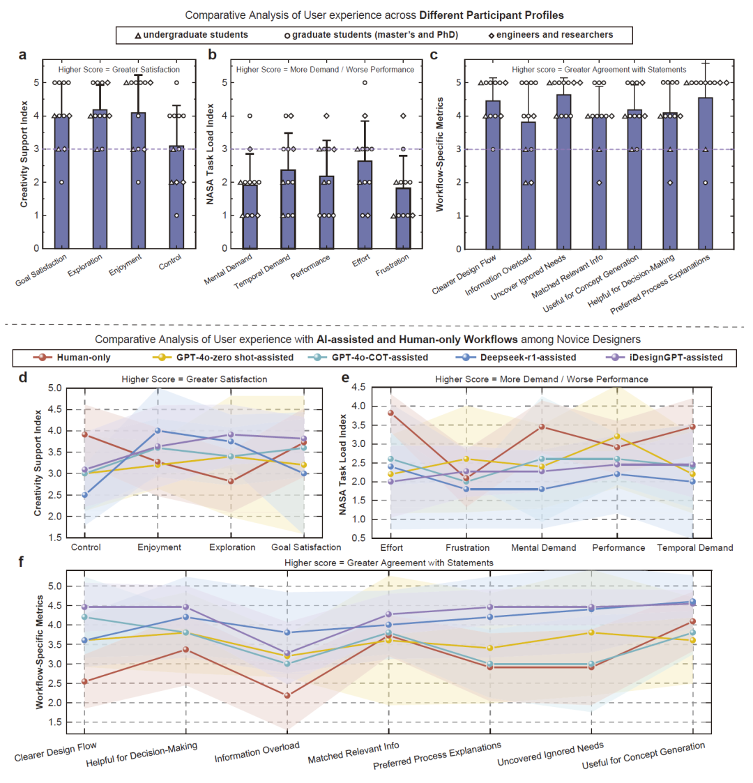 该框架引入覆盖度、多样性与新颖性等定量指标,为早期概念设计提供可量化支持。在六项公开工程设计挑战中,iDesignGPT 在原创性与模块化方面持续优于 GPT-4o 零样本、GPT-4o 推理提示和 Deepseek-r1。两项受控用户实验显示,不同背景用户对系统普遍持积极态度,尤其是初学设计者在使用 iDesignGPT 时认知负担更低,设计流程更加清晰。研究结果表明,iDesignGPT 为将语言模型智能体与工程设计方法深度融合提供了可行框架,可同时支持专家与新手开展高质量概念设计。