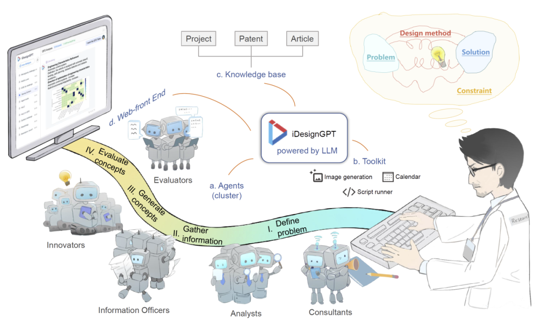 研究人员构建 iDesignGPT 框架,包含四个核心组件:多智能体系统、知识库、工具集和交互式前端界面。系统通过协同智能体执行四个关键阶段:问题定义、信息收集、概念生成与方案评估。