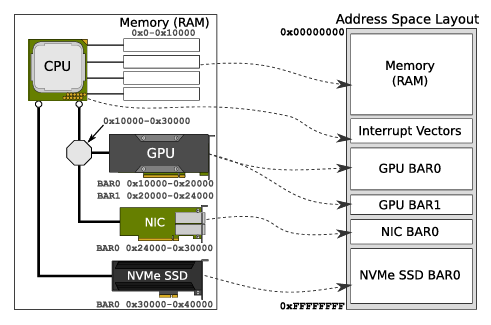 GPU向BIOS / OS申请一段物理地址空间(即BAR区域),并将该区域与部分显存空间绑定,这样RDMA网卡(注意GPU和RDMA网卡需要在同一个RC下,)只需访问该BAR 地址,即可间接访问对应的GPU显存物理地址。