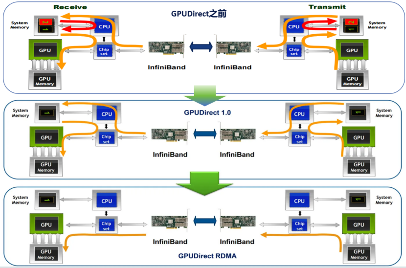 GPUDirect 1.0通过下面技术手段,通过共享缓冲区,消除了CPU参与的InfiniBand网卡与GPU之间的内存拷贝,减少了30%的GPU之间的通信时间。