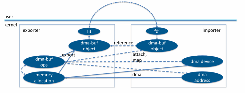 它允许一个设备驱动(exporter)将其内存区域安全地导出成一个dma-buf object,供另一个设备驱动(importer)直接访问。