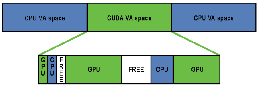 UVA 将应用程序的 VA 空间分为CUDA 管理区与OS管理区,其中CUDA管理区又细分为GPU 地址、CPU 地址、FREE 预留地址三类;