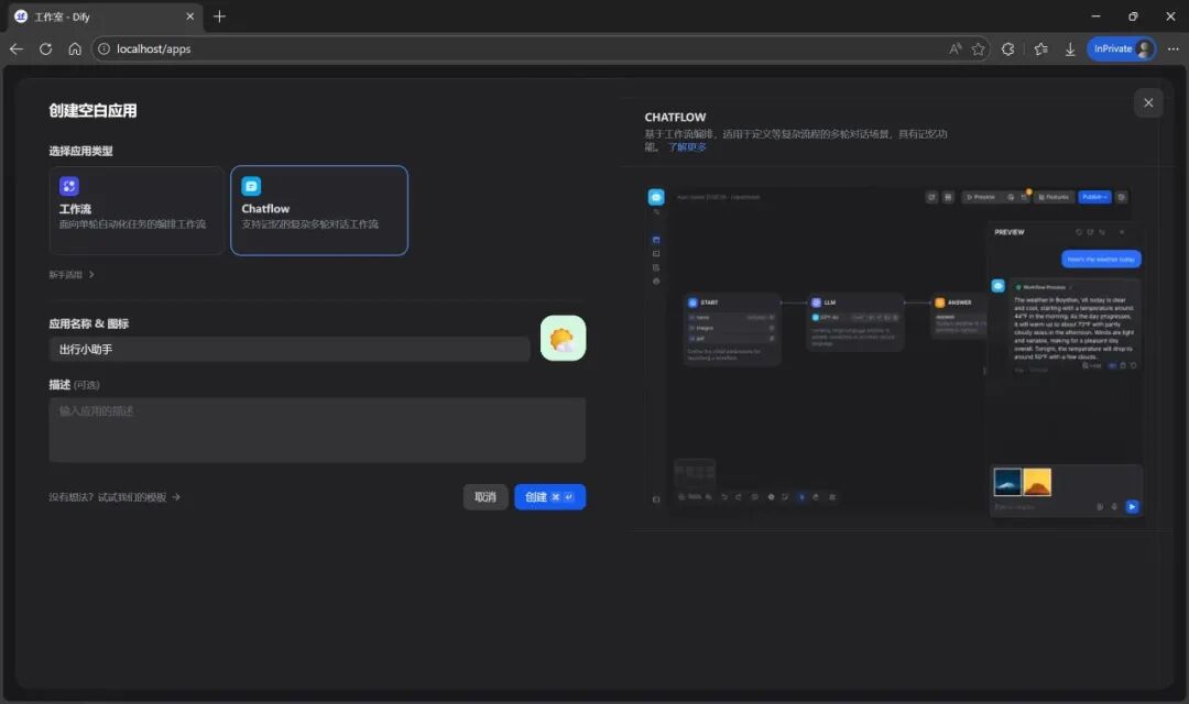 创建一个新的 Chatflow 应用 出行小助手。