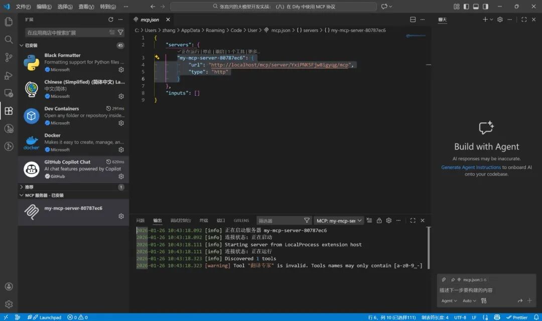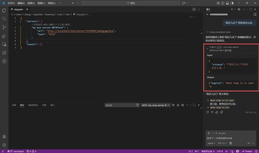 服务端点 URL 留存备用。拿到了 URL 后,在任意支持 MCP 调用的应用中都可以使用刚刚配置好的工作流,这里以 Visual Studio Code 为例。