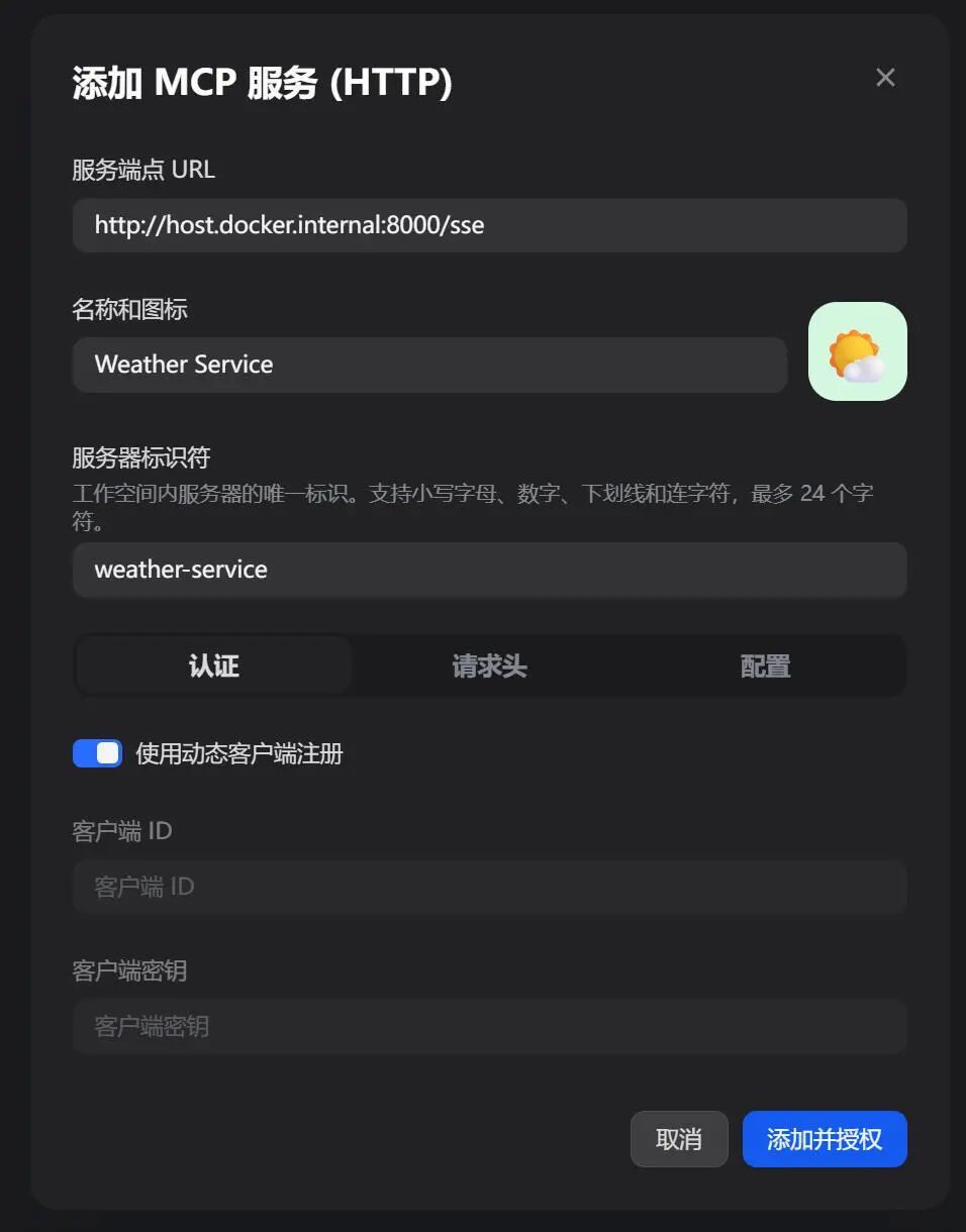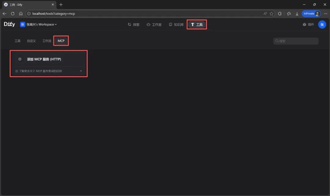 现在 MCP 服务已经跑起来了,下面需要告诉 Dify 去哪里找到这个服务。回到 Dify 的网页界面: