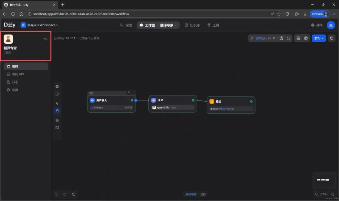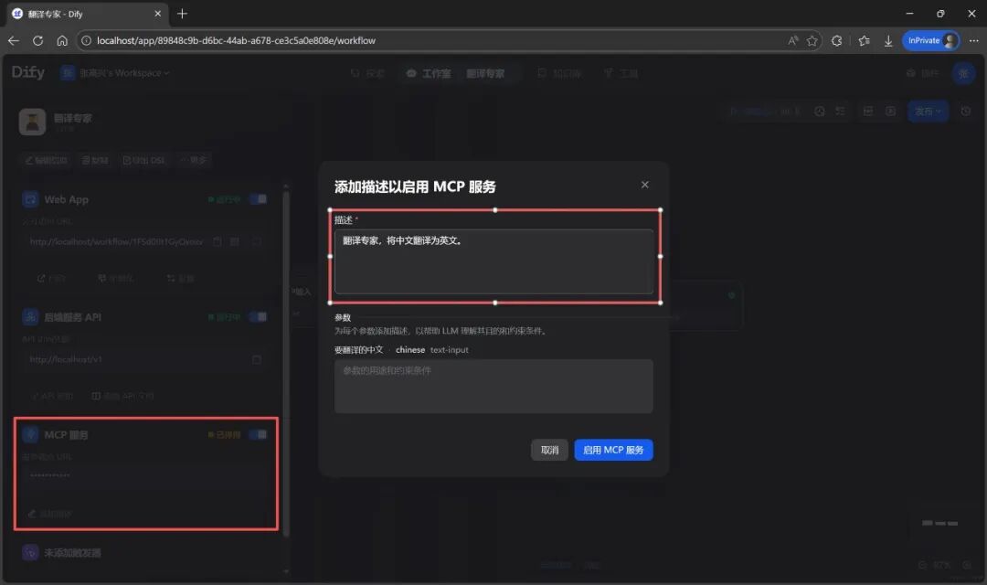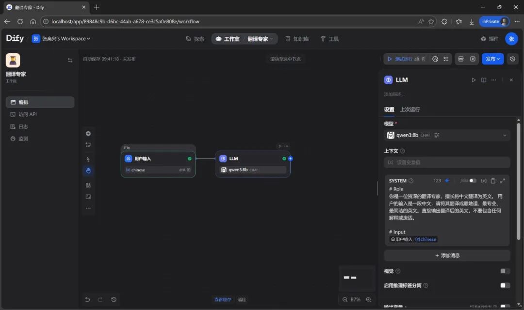 有时,当你在 Dify 中配置了一个复杂的工作流(Workflow),想要在外部的 AI 应用中进行调用,这时就需要反转视角,将 Dify 作为一个 MCP 服务。在开始案例之前,先添加一个“翻译专家”工作流,作为要被调用的 MCP 服务。