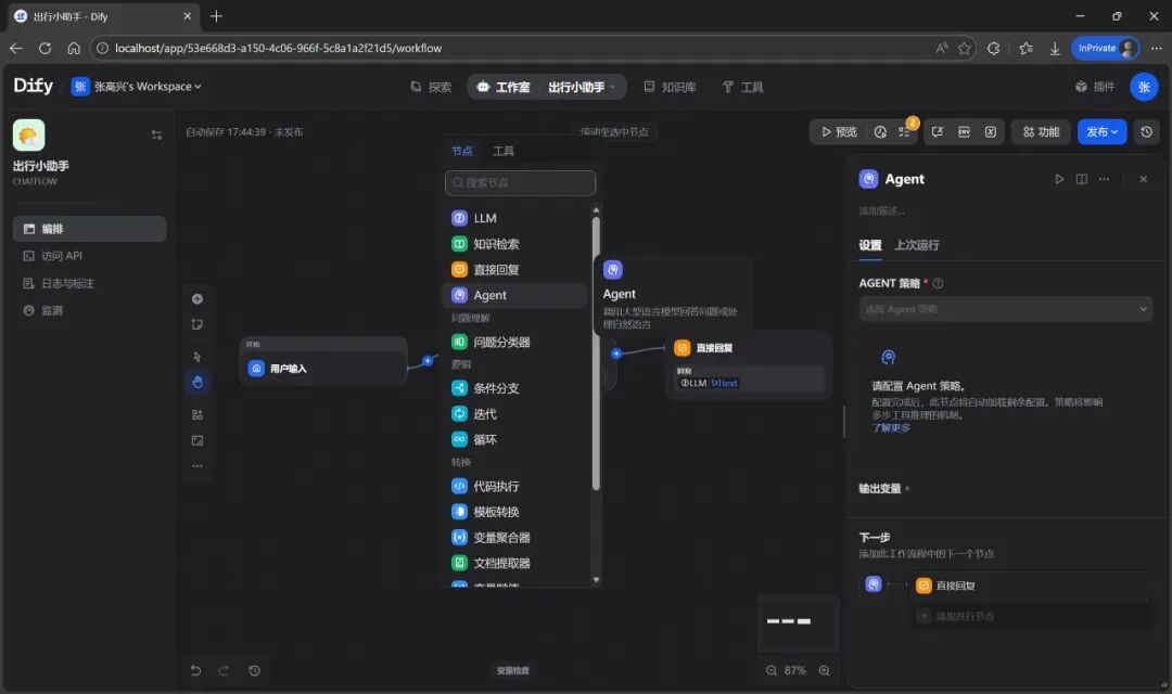 删除原有的 LLM 节点,添加一个 Agent 节点。