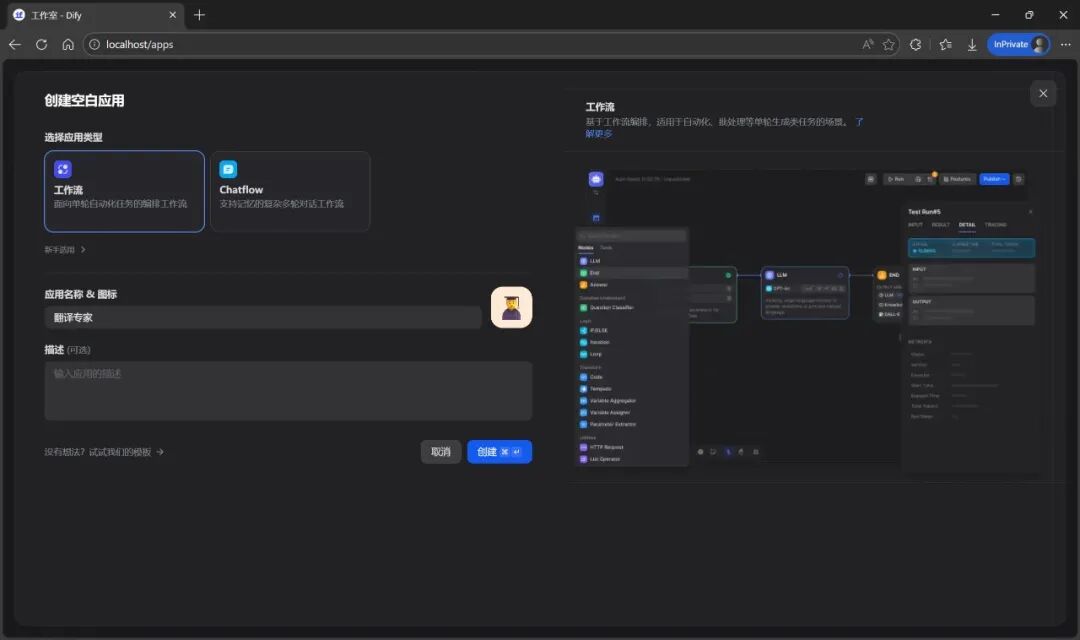 在 Dify 首页点击 创建空白应用,选择 工作流,命名为 翻译专家,开始节点选择 用户输入。