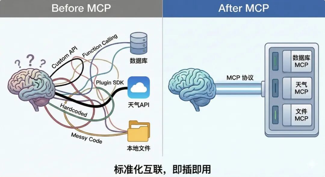 想象一下,你想要构建一个超级 AI 助手,它不仅能陪你聊天,还能帮你查询实时天气、读取本地数据库里的库存信息等。为了实现这些功能,在过去,你需要为每一个外部工具编写特定的“适配器”。AI 模型本该是通用的智能大脑,但连接外部世界(工具和数据)的方式却极其割裂和破碎,需要花费大量时间在“对齐接口”这种低效的重复劳动上,MCP 协议应运而生。可以把 MCP 想象成 AI 世界的 USB 接口。USB 的出现改变了一切,它提供了一个统一的标准:无论你是鼠标、键盘还是 U 盘,只要符合 USB 协议,插上就能用。MCP 就是要成为 AI 与外部数据/工具连接的 USB 标准。它将世界分成了两端:
