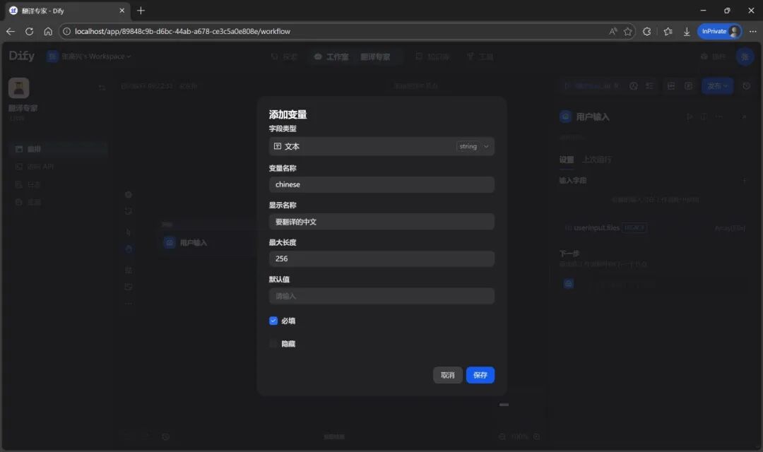 点击 用户输入 节点,添加输入变量 chinese,即要翻译的中文。