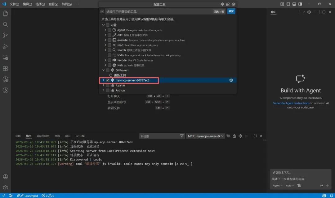 配置工具 列表中,只勾选刚刚添加的 MCP 服务,用于测试。