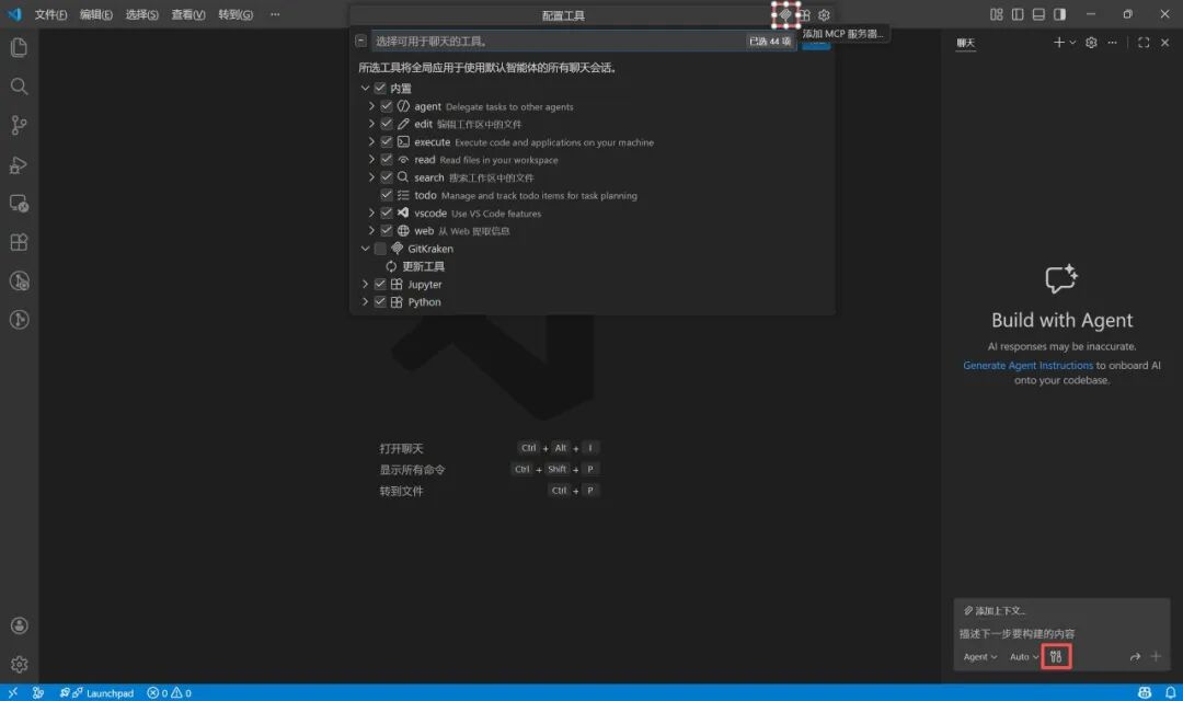 配置工具 按钮,在弹出的顶部菜单中点击 添加 MCP 服务器。