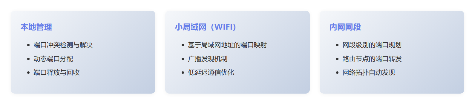 本地管理 | 端口冲突检测、动态分配、释放回收 |
