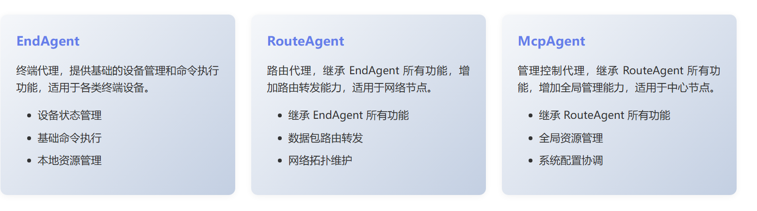 SDK 设计了三层 Agent 继承体系,不同角色的 Agent 基于继承实现功能复用与扩展,完美覆盖从终端设备到中心管理节点的全场景需求: