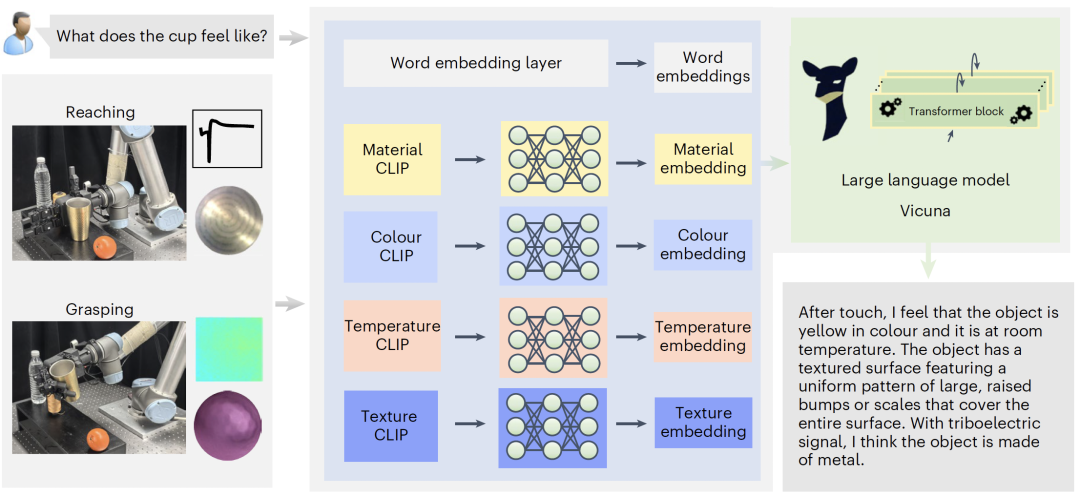 为了处理极其复杂的触觉输入,系统并行集成了四组预训练的 CLIP(对比语言—图像预训练)模型作为模态编码器,将图像化的触觉特征(包括颜色、纹理、温度和材质信号)提取为深层特征向量。