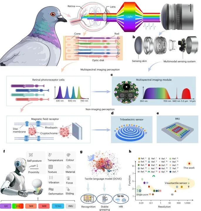 在此背景下,清华大学深圳国际研究生院丁文伯团队联合无界智航(Xspark AI)及多所国内外科研机构,从鸽子卓越的多光谱视觉和非成像感知机制中获得灵感,研发出了一种仿生多模态触觉传感器 SuperTac。