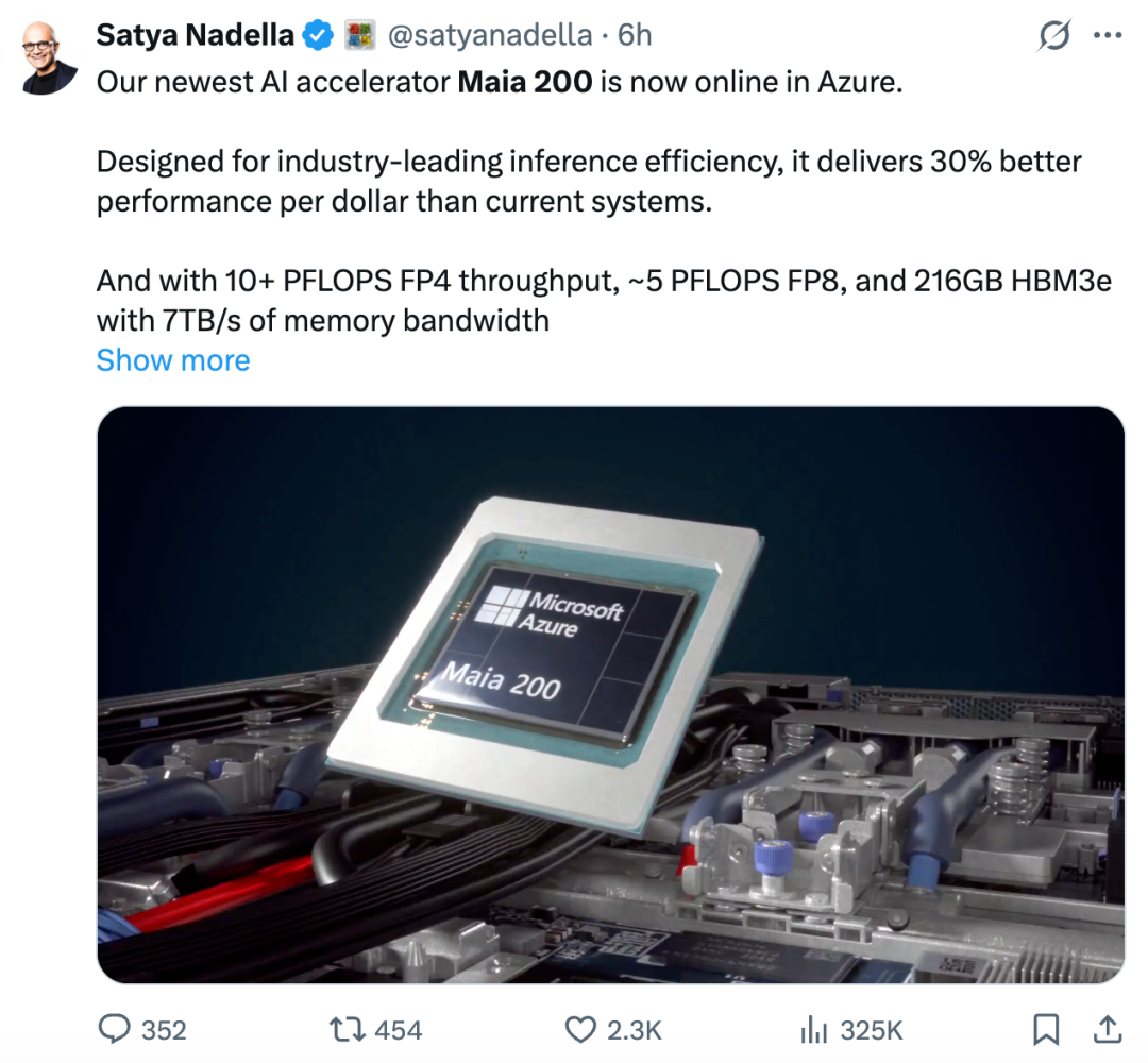 微软原定于 2025 年发布的下一代 AI 芯片 Maia 200,终于在今天问世!