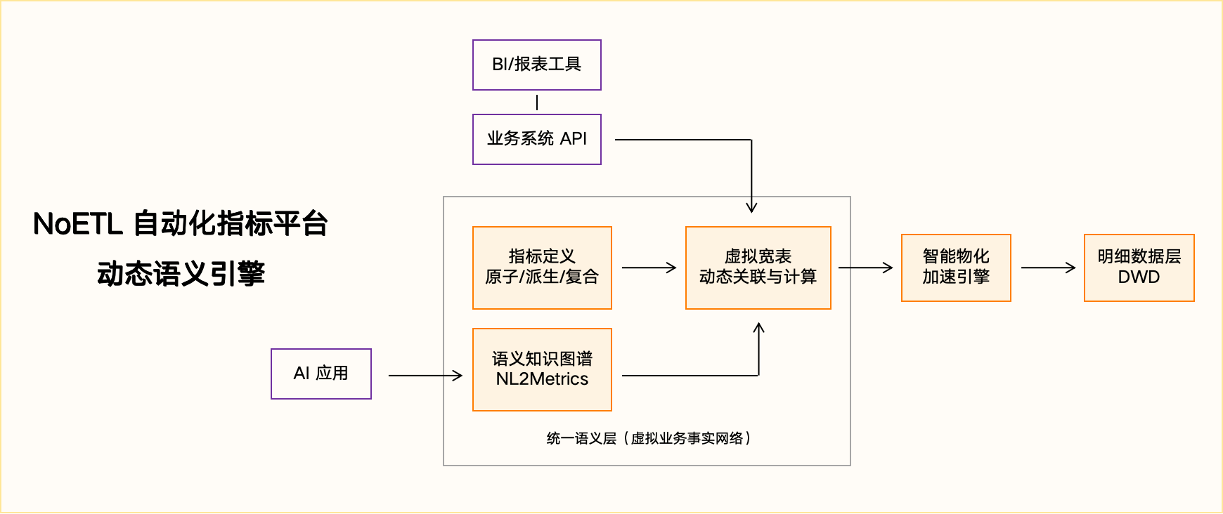 这正是 NoETL 平台的核心优势——应对变化。其“语义模型驱动”的架构,将易变的业务逻辑(指标口径、维度关联)上浮至可配置的语义层,而将稳定的物理存储与计算下放。当业务变化时,只需在语义层修改或新增配置,无需改动底层 ETL 和物理表。这种解耦设计使平台天生具备极强的业务适应性。