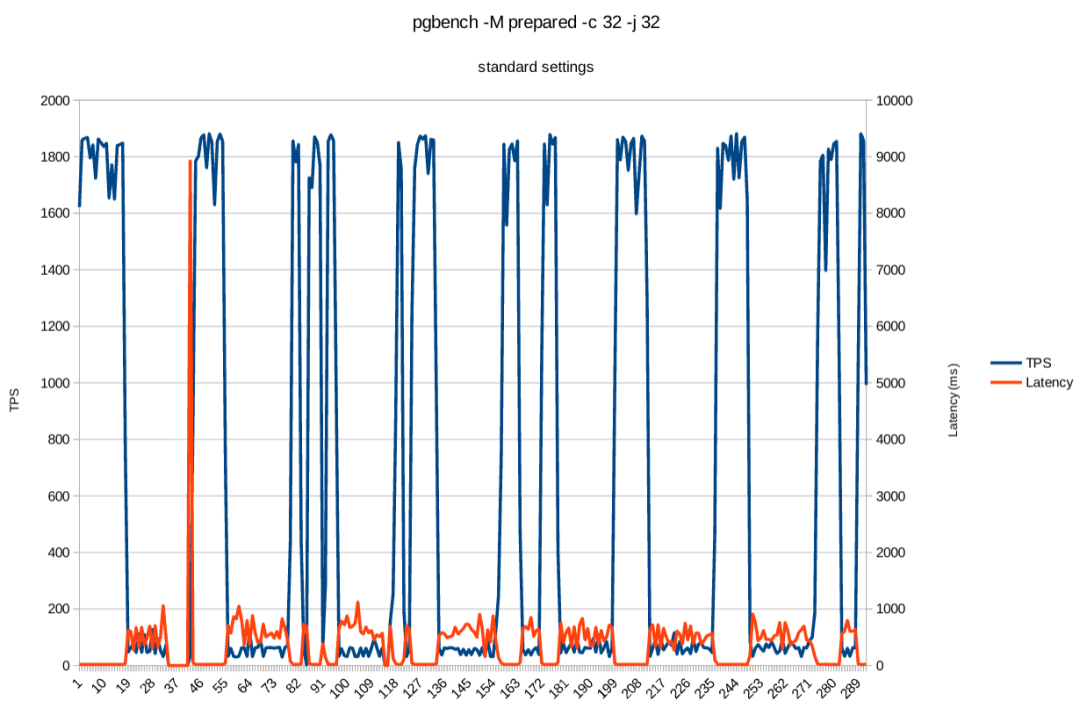 在以上的图形中可以明显的看出使用默认的shared_buffers值时,TPS 出现了拉锯式的波动,出现的尖峰和谷底明显,到达最高TPS时便很快下降,在37秒时延迟突然出现了剧增的情况。而把 shared_buffers 调到16GB 时,如下图则明显改善了很多。