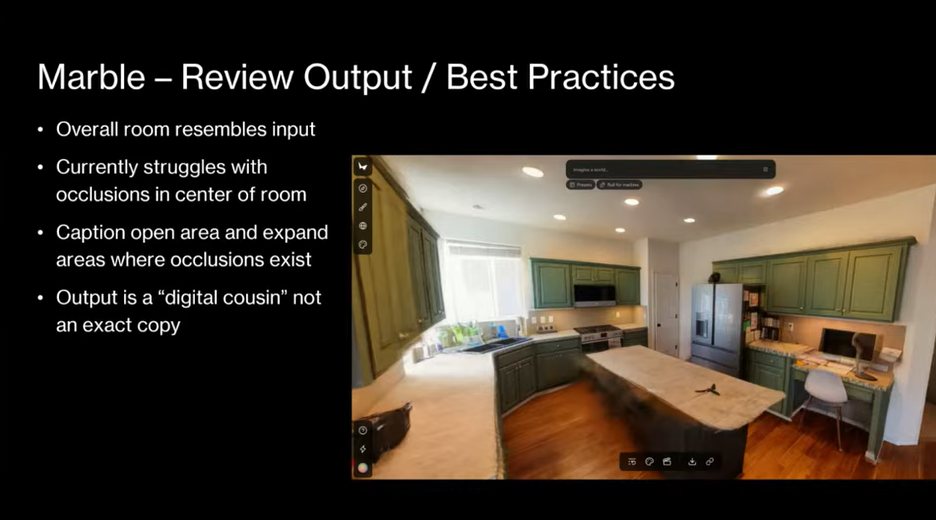 不过需要注意的是,Marble 并非为精确复刻场景设计 —— 其几何精度存在一定局限,例如复杂空间(如厨房中岛)可能出现重建缺口,不适合需要 1:1 还原真实场景的需求。它更适合追求快速迭代、大规模环境覆盖的场景,如机器人通用任务训练、多场景适配验证等。