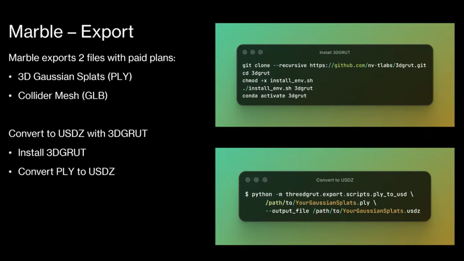 生成完成后,Marble 会输出 PLY 和 GB 格式文件,通过 Nvidia 开源工具 3D Grutt,仅需一行代码即可将其转换为 USDZ 格式,全程操作简单高效。转换后的文件可直接拖拽至 Isaac Sim 等仿真平台,无需额外适配。