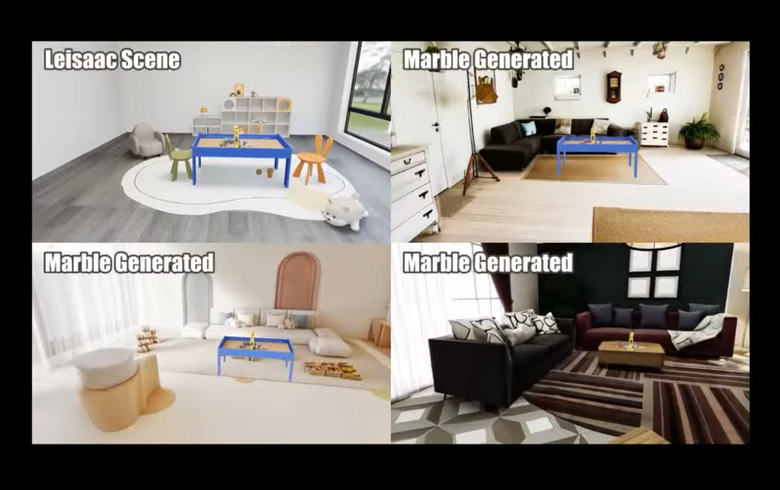 值得注意的是,Marble 生成的场景被称为 “数字近亲”—— 它不会 1:1 复刻真实空间,而是基于输入生成风格相似、结构合理的合成环境。这种特性使其特别适合机器人训练场景,无需绝对精准的复刻,只需保证环境的多样性与真实性即可。