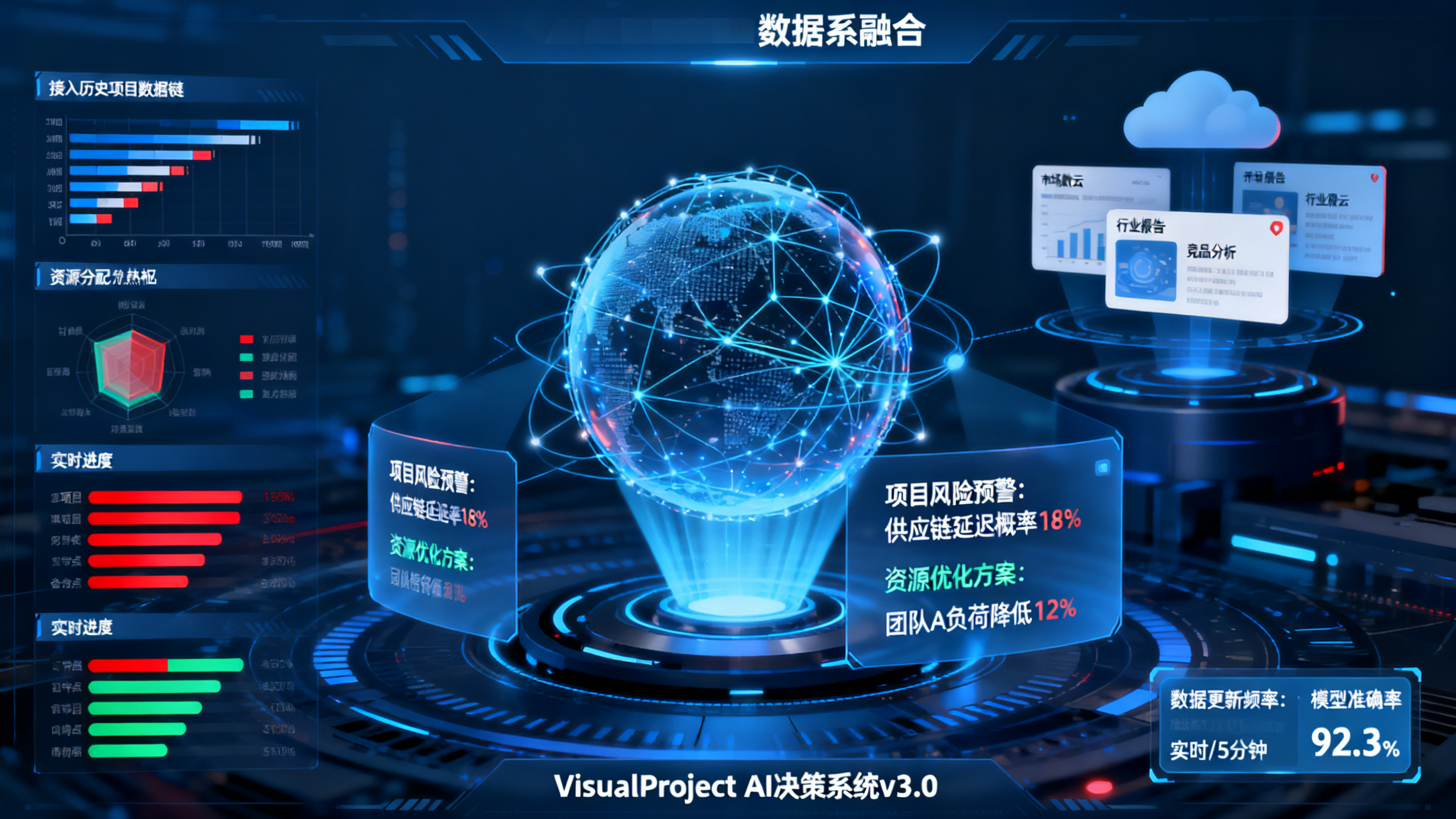 AI 需求洞察与标准化 :通过自然语言处理 (NLP)、多模态解析技术,整合业务方的文字 / 口头需求、行业竞品数据、历史同类项目需求文档,自动提取核心需求点、识别需求冲突与模糊点,生成标准化的需求清单和 WBS(工作分解结构)。例如VisualProject 的 AI 需求模块,可将金融科技项目的需求理解准确率从 70%-80% 提升至 90% 以上,减少后期需求变更带来的返工成本。AI 工期与成本精准估算 :基于企业历史项目的海量数据(工期、成本、资源投入、难度系数、外部环境等),通过机器学习算法构建估算模型,输入新项目的规模、需求、资源等参数,即可输出精准的工期、成本估算结果,误差率较人工经验估算降低 50% 以上。AI 智能资源配置 :基于人员 - 技能 - 项目的三元关系图谱,结合团队成员的负载情况、专业能力、历史绩效、可用时间,自动为各任务匹配最优执行人,同时检测资源冲突(如核心人员多项目重叠、某技能岗位人员缺口),并给出资源调剂建议,解决传统 “抢资源、缺人手、人岗不匹配” 的问题。(二)执行阶段:AI 实现全流程智能协同,提升执行效率