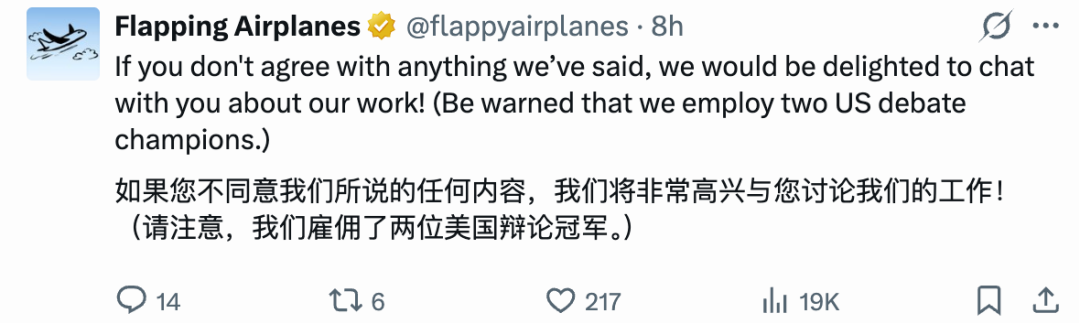 「Flapping Airplanes」这个名字,正是公司文化的写照:我们是谁、我们在做什么,本身就是 out-of-distribution 的。非常非典型的活跃性公司文化,从他们的推文中能看出一丝严谨学术之外的跳脱。