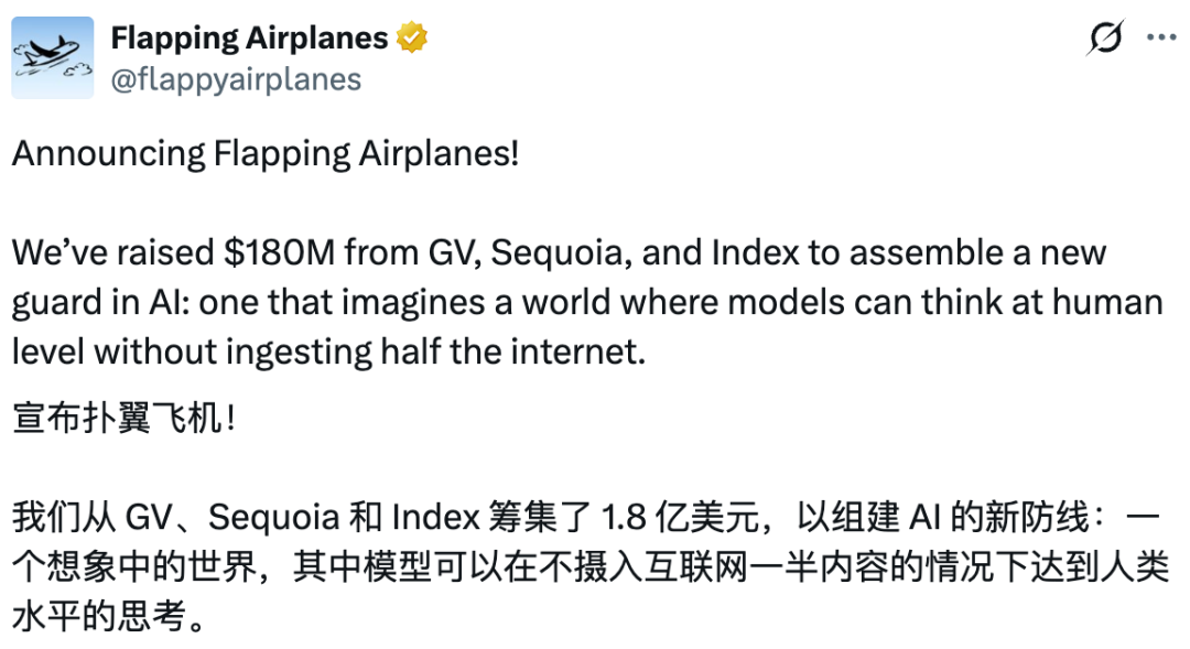 Flapping Airplanes 称,其融资用来组建 AI 的新防线:一个想象中的世界,模型可以在不用摄入互联网一半内容的情况下达到人类水平的思考。