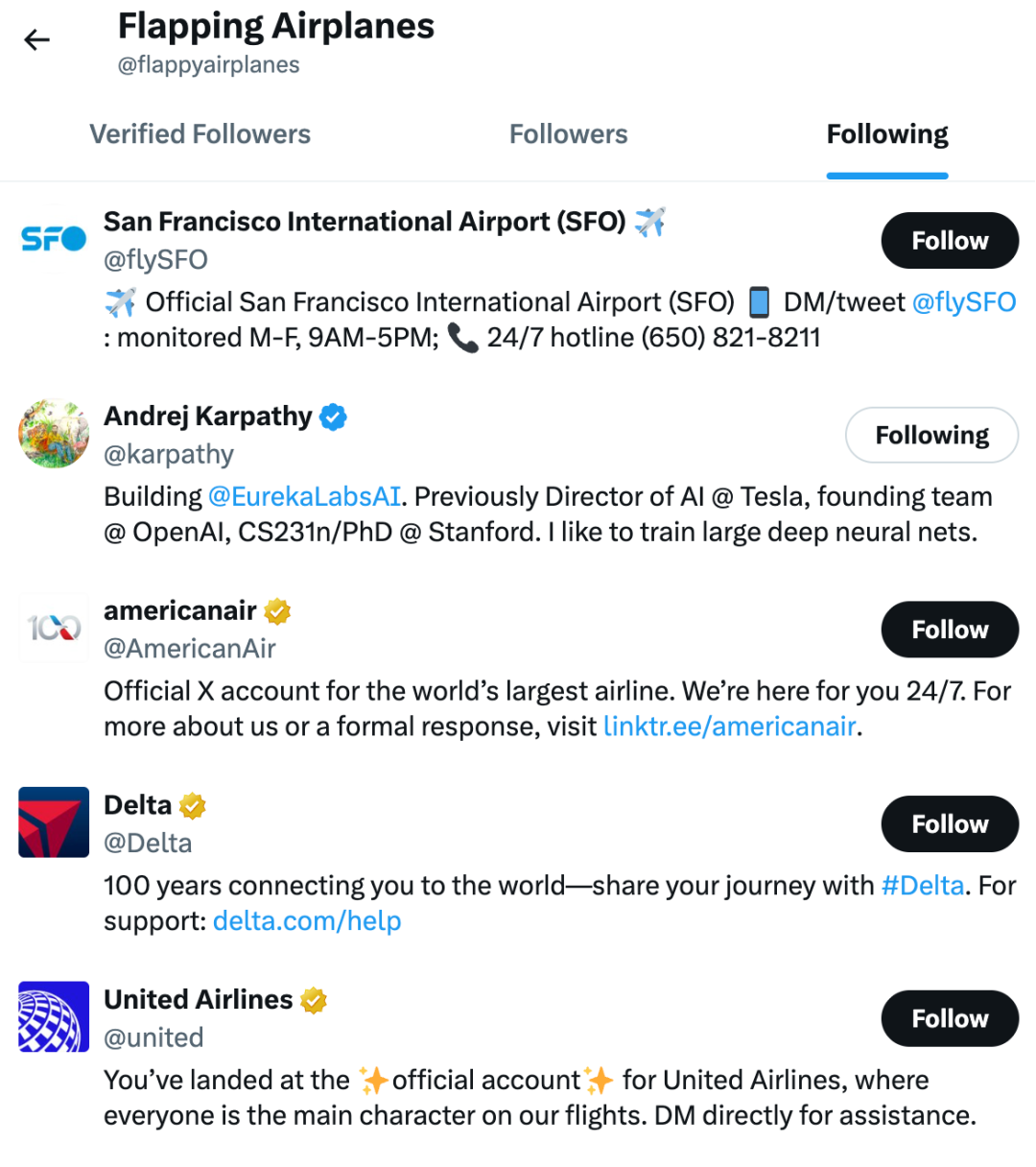 我们甚至发现,Flapping Airplanes 官方推特的关注列表里,真的有旧金山机场和两大美国航司……(这是真的要起飞了)