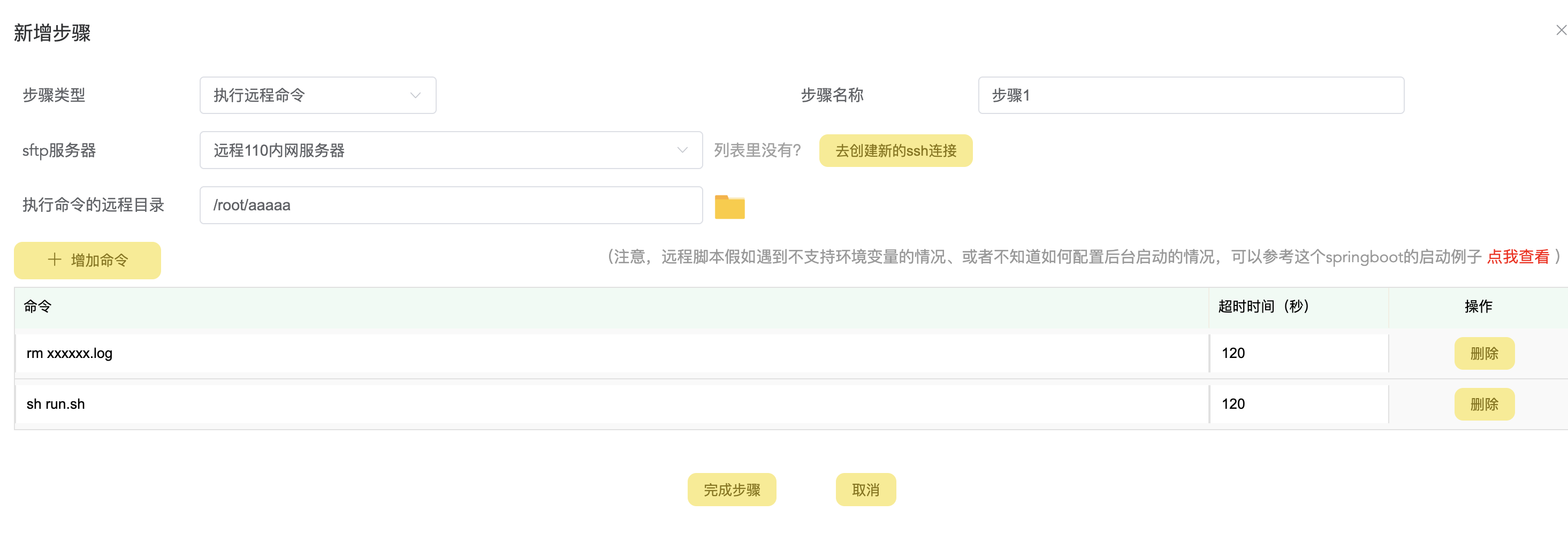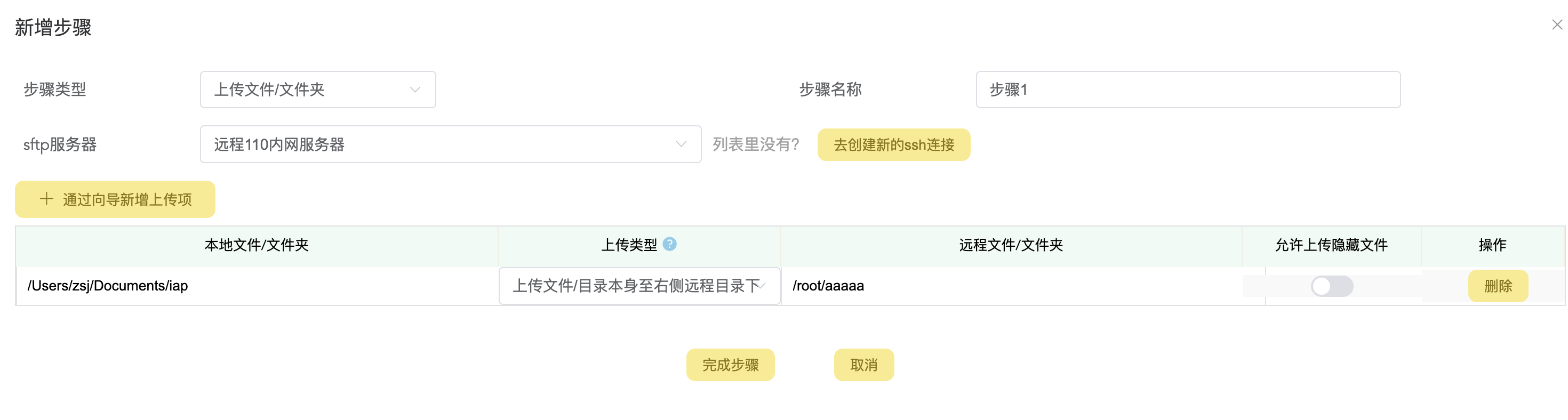 步骤类型可以选文件/文件夹上传类型、执行本地命令类型和执行远程命令类型,比如上传类型的步骤界面如下: