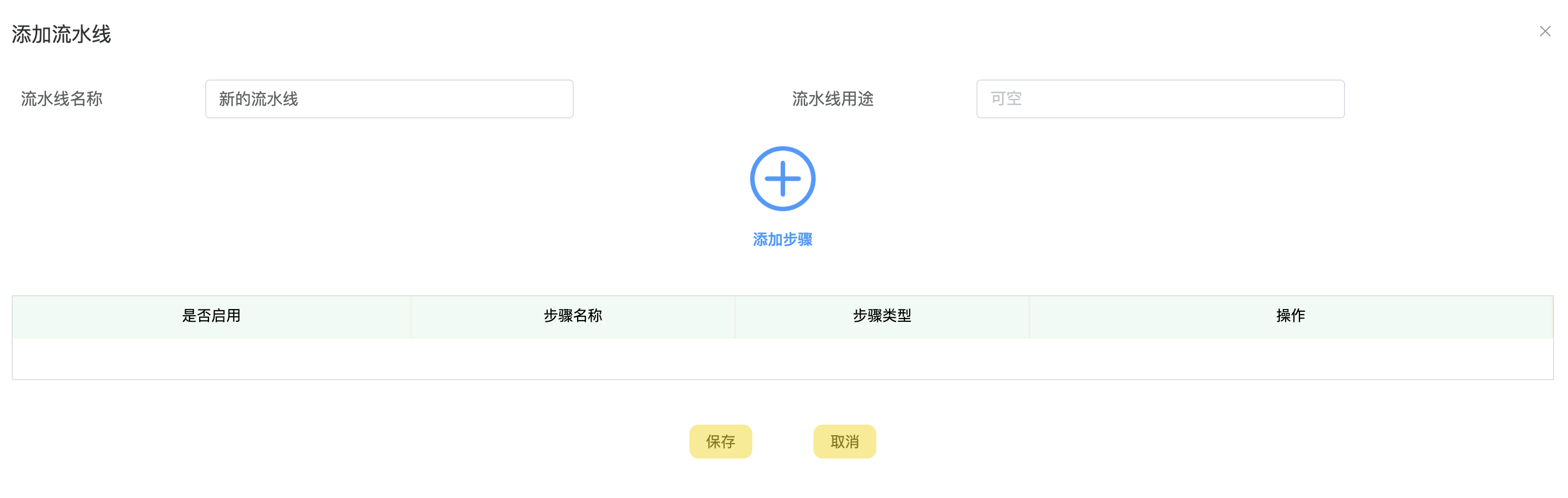 点击这个加号即可开始创建流水线,点击进去之后,可以填写流水线的名称等信息,然后点击步骤,将进入步骤的详细编辑界面,如下图: