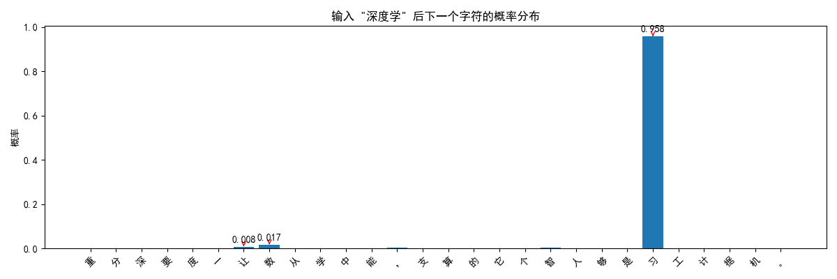 • 模型看到"深度学"后,认为下一个字符是"习"的概率最高