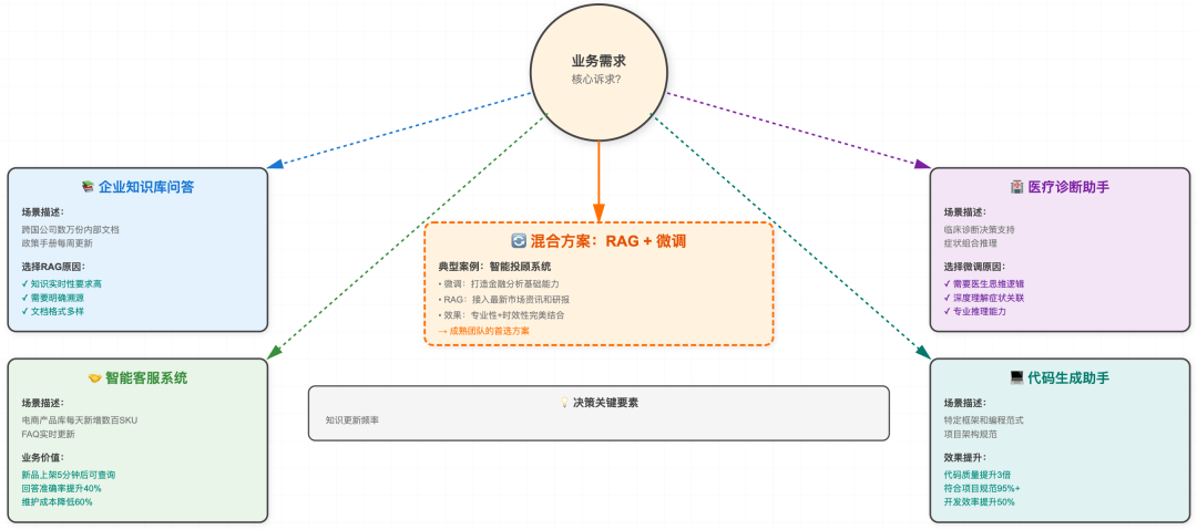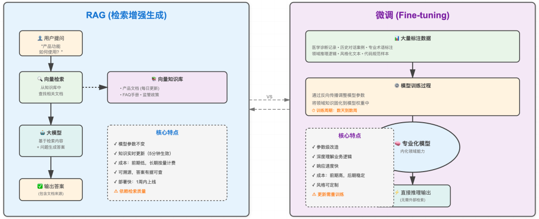 如果你的核心痛点是知识频繁更新、需要溯源、预算有限,RAG是更合理的选择。如果你要打造深度行业能力、追求极致性能、用户量足够支撑成本,微调值得投入。