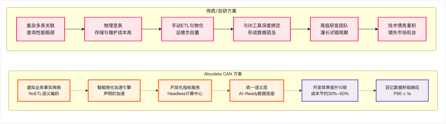 核心区别在于专注点与实现方式。传统数据虚拟化侧重异构数据源的连接与整合。Aloudata CAN 的“语义编织”专为指标分析场景设计,核心是基于 NoETL 理念的统一语义层和指标计算引擎。它不仅在逻辑层虚拟化数据关联,更提供了强大的声明式指标定义、自动化生产与 AI 原生适配能力,是面向分析场景的“垂直化”解决方案。
