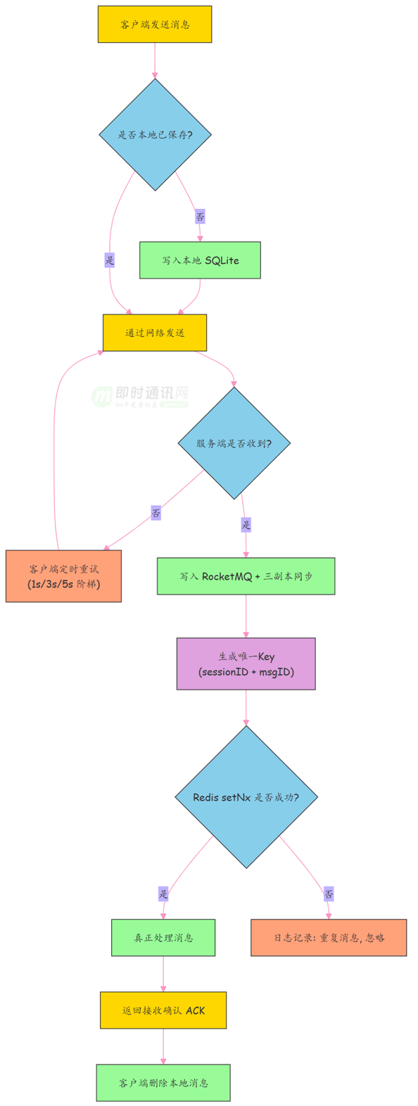 避免雪崩式刷屏,既保障可靠性,又不压垮服务。只有等到服务端明确说“我收到了”,才把这条消息从本地删掉。