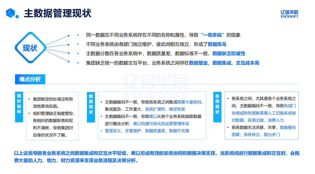 随着投资业务的开展,投资集团常常需要通过并购扩大业务范围,这也带来了系统整合的挑战。不同企业的系统采用不同标准,整合这些异构系统的主数据成为棘手的难题。