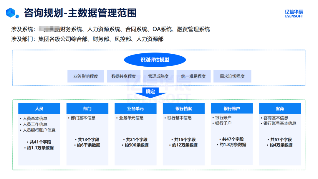 梳理主数据标准是关键一环。投资集团的主数据可分为:组织主数据(包括被投企业、子公司、内部部门等)、人员主数据(包括核心团队、董监高、关键岗位人员)、资产主数据(包括投资项目、固定资产、金融资产)、财务主数据(包括会计科目、成本中心、利润中心)。