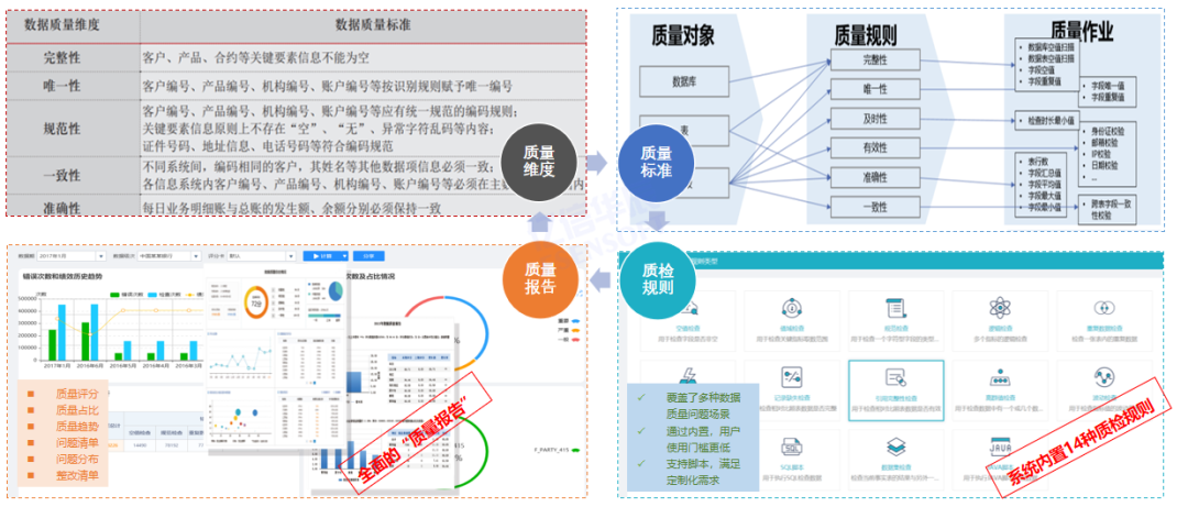 - 数据质量管理流程:包括质量规则定义、问题发现、分发、整改、验证的闭环流程。