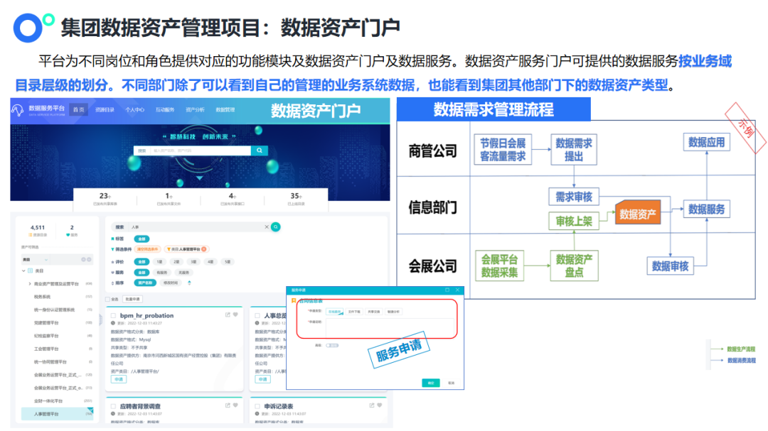 - 数据资产门户建设:建立统一的数据资产门户,提供数据目录检索、数据地图浏览、数据申请、数据使用情况跟踪等服务,提升数据获取便利性。
