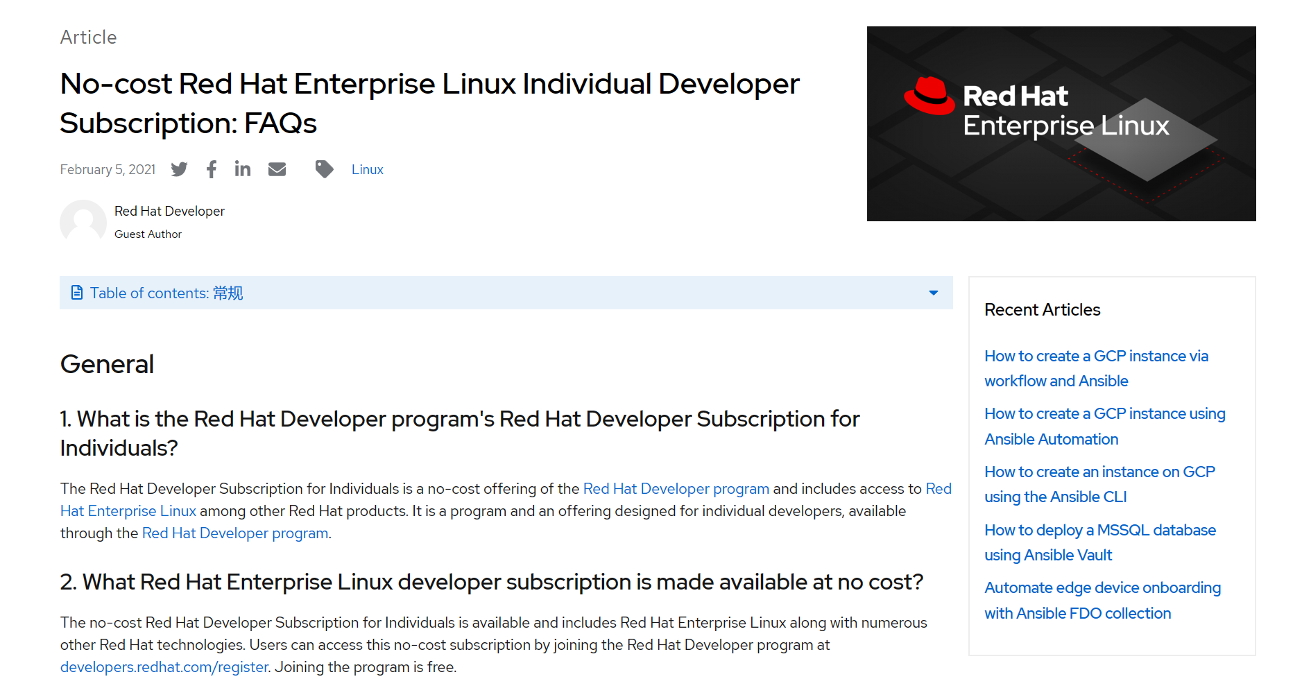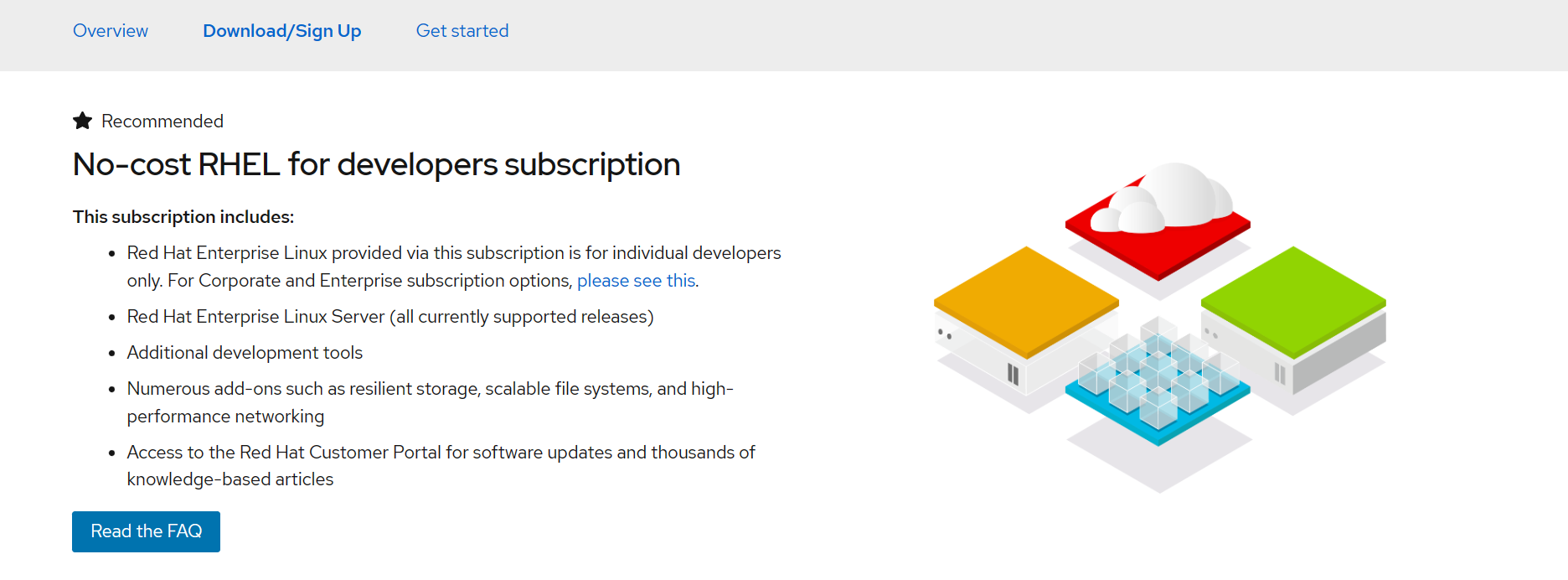 下滑看到No-cost RHEL for developers subscription 面向开发人员的免费 RHEL 订阅,选择 Read the FAQ 阅读常见问题;